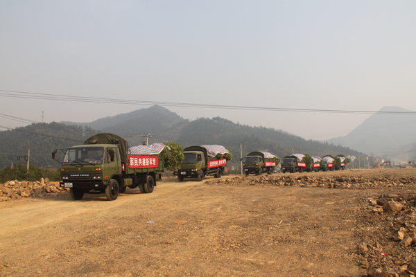下午3点50分,八辆一字排开的军车全部装上了苗木,并进行了仔细的遮盖和捆绑。随后,在噼噼叭叭的鞭炮欢送声中,车辆徐徐开出基地,向舟山方向驶去。