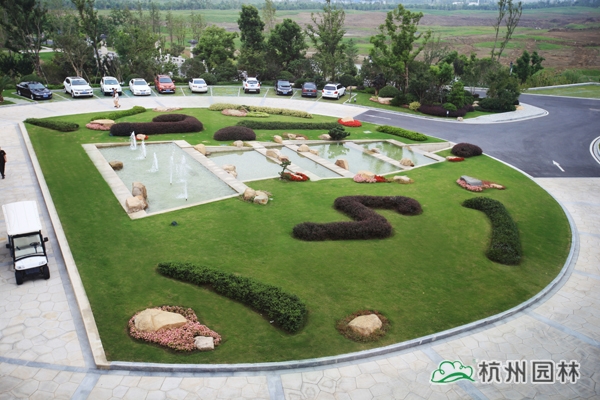 2号楼大厅门前,在大面积的草坪上,选用红花檵木、金边胡颓子、茶梅等一些小毛球,用中国书法的用笔法则,十分简洁地“书写”出点、横、竖、钩、提、撇、短、捺,即代表中国书法中笔画大体的“永”字八法,传达出“大道至简”的书法精髓。这种匠心独运的植物配置,将园林的造景手法与中国书法艺术完美配合,景观效果令人耳目一新,使项目的整体景观品位得到了质的提升,是中国传统园林造景手法的典型运用。