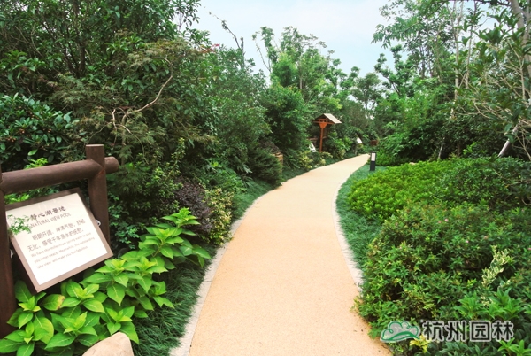 五千年的中国历史文化,恢宏浩瀚,为园林造景提供了取之不竭的素材;园林景观,也因为传承了深厚的文化底蕴而散发出独特的艺术魅力。作为一个旅游度假项目,对园林景观的要求,不仅仅只是精致大气、风韵天成的美景,更需要有深厚的文化底蕴,彰显独一无二的中国元素。为此,在2号楼大厅门前,用植物造景再现代表中国书法中笔画大体的“永”字八法,彰显中国书法的魅力;在泡池的建造上,运用老石碾、压门石、老磨盘等老石材,打造出怀旧气息浓郁的乡土风情。
