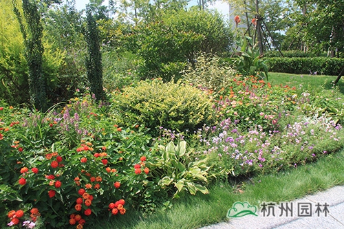 人来人往的杭州火车东站西广场,草坪碧绿,树木葱郁,更有一座名为“西湖印象”的立体花坛吸引着众多游客的眼。而在广场通往天城路方向的一片草坪里,一处100平方米左右的花境小品却格外引人注目,红黄粉交相辉映的五色梅、叶秀花艳的香彩雀、紫色优雅的翠芦莉、飘逸秀气的小兔子狼尾草、青翠挺立的直立冬青、叶色嫩黄的黄金香柳……丰富的品种,艳丽的色彩,既展现出植物的色彩美,又营造出丰富的群落美,使得这处小花境成为这片风景的点晴之笔。