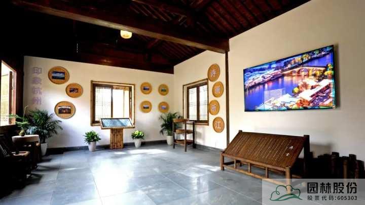 在屋内,是一个室内展厅,它以现代化数字媒体手法和图文展板来为观众讲述来自浙江的故事。展厅内容共有三个部分,为“印象杭州”“诗画浙江”“美丽家园”,通过丰富的表现方式,展现了浙江发展成就,描绘了一幅乡村振兴的美好图景。
